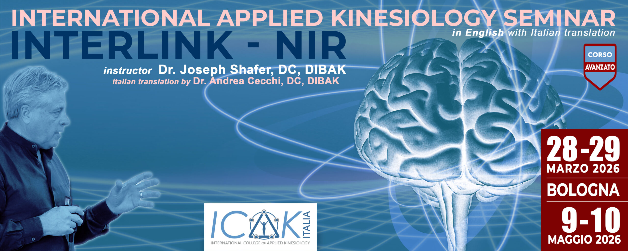 Il metodo più innovativo per la valutazione e il trattamento delle conseguenze di ictus e traumi cranici direttamente dalla mente del suo ideatore. Il Dr. Shafer, Chiropratico e DIBAK di fama mondiale, incredibile sviluppatore di concetti innovativi, ha portato l’ennesimo contributo alla Kinesiologia Applicata nella valutazione di alcune delle lesioni più comuni del cervello. Il suo metodo Interlink che ha segnato una svolta nella risoluzione di problemi articolari e legamentosi viene adesso esteso alla valutazione del sistema nervoso centrale.